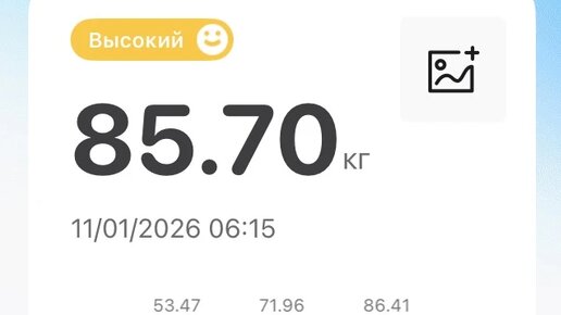 Чему б радовалась, да? Радуюсь. Потому что много-много лет у меня у меня было что? У меня была шкала цвета пожарной машины и было написано: ожирение. Даже вот так было написано. ОЖИРЕНИЕ. Вот прям такими противными буквами. О-ЖИ-РЕЕЕЕ-НИИИ-ЕЕЕЕ... И впервые за много лет я не вижу вот этих противных букв и красную шкалу на своих умных весах. Я вижу - желтую шкалу. С надписью просто: "высокий вес": Зимой! Урра! У меня в январе, после встречи Нового года и всяких там салатиков - наконец-то ВЫСОКИЙ...