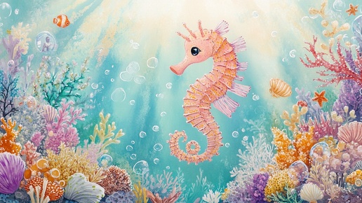 Создано на основе запроса: underwater pastel cartoon world with a friendly smiling seahorse swimming near colorful coral reefs, surrounded by starfish, small fishes, sea shells and bubbles, light rays from above, magical and calming ocean background, very cute and dreamy, for children under 7, no text --- Автоперевод: Подводной пастельный мультипликационный мир со дружелюбным улыбающимся...