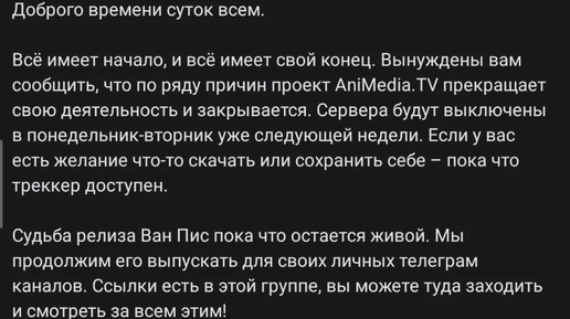 Являясь старожилом русского фандаба, «Animedia.tv», основанная в 2009-ом году, по сей день не утратила своей популярности. По словам основателя (Shachiburi), это был «виток новой эры, которая началась банально: от нечего делать». И 7 октября сообщили об официальном закрытии проекта «Animedia.tv». Что ж, нам надо серьезно поговорить)Некоторые из вас уже успели прочитать сообщения с групп других участников проекта и знают суть, но для остальных, её сейчас озвучу я. Проект АниМедия.ТВ закрывается спустя столько лет работы...