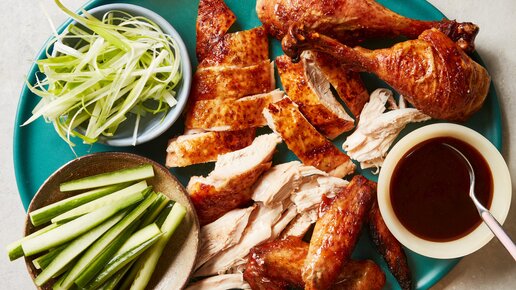 Этот ужин из курицы вдохновлен любимой многими уткой по-пекински. Классическое китайское блюдо требует колоссальных затрат сил и времени. Сначала повар опускает птицу в кастрюлю с кипящей водой, что помогает вытопить жир и натянуть кожу, затем утка смазывается медом или мальтозным сиропом (он придает ей характерный темно-коричневый цвет), далее тушку сушат на воздухе в течение нескольких дней. Перед жаркой между кожей и мясом продувается воздух, чтобы в процессе запекания из птицы вытапливался и стекал лишний жир...