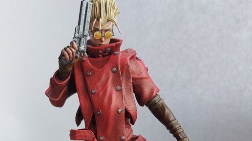 После Сильваны хотелось сделать что-то оригинальное, а тут в мои руки попала 3д моделька главного героя из аниме Триган. Решено! Печатаем Вэша! Модель оказалась не самой простой в сборке. Куча деталей стыкуются на видных местах. Из за этого пришлось много подгонять и немного шпаклевать. В итоге получилась заготовка под грунт. Начать я решил с головы. Люблю начинать с мелких отдельных деталей. (Уникальный шанс увидеть как выглядел бы Вэш в черном) Из за сложных стыков пришлось собрать торс до покраски и потом красить в один заход...