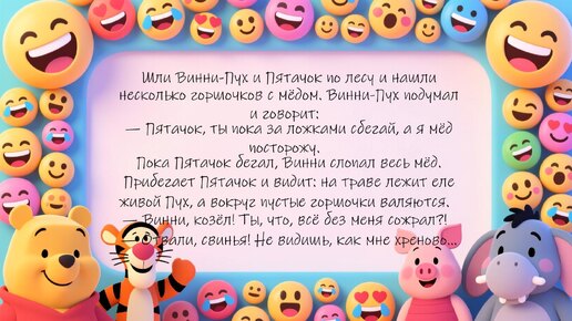 Моя подборка анекдотов из серии Винни-Пух и все-все-все. 🔥Рубрика 👩 ALISA PRO ЮМОР ⚡заставит вас улыбаться 😄 и смеяться 🤣 ✨ ✨ ✨ — Скажи, Винни, а это правда, что к тебе сегодня приезжают родственники, а ты ещё ничего не приготовил? — Что, Пятачок, страшно?.. ✨ ✨ ✨ Ослик Иа-Иа спрашивает у Винни-Пуха: — Винни, это правда, что Пятачка в армию забрали? — Да, в железном камуфляже с надписью «Тушёнка»...