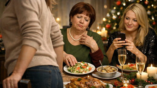 Я смотрела на свекровь, которая с брезгливым видом отодвигала тарелку с моим фирменным салатом. Её сестра, тётя Зина, театрально вздыхала над жульеном. А золовка Света уже доставала телефон - наверняка фоткать для подруг, какой ужас я устроила. И тогда я встала из-за стола. Всё началось месяц назад. Максим пришёл домой и сходу заявил: - Лен, мама просит отметить Новый год у нас. Они с тётей Зиной и Светкой приедут. Я чуть не подавилась чаем. - Макс, мы же договаривались встречать вдвоём! У тебя вообще память есть? - Ну, пожалуйста - он сделал жалобное лицо...