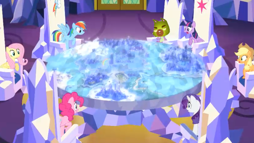 Смотрим на культистов и ужасные параллельные миры в 5 сезоне Осторожно, добрые путники, дальше будут спойлеры Арка Прелестная Карта Начало 5 сезона Начинается новый сезон с рутины героинь по изучению нового замка-дома Твайлайт. Искорка размышляет о том, как распространять магию дружбы по всему миру, если замок то находится в Понивиле. Ответом на её вопрос стало появление каменного круглого стола с проецируемой на него картой. Странно что не отображаются области за пределами Эквестрии, наверное там дальше живут драконы...
