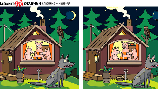 10 отличий. Сегодня наша загадка про трёх поросят и волка на службе у них. Тест на внимание.