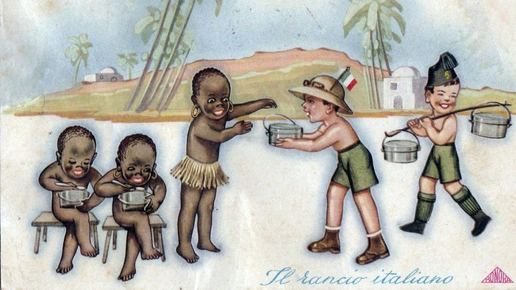 Художник Бонора (Италия). Итальянский рацион. Почтовая открытка. 1930-е 3 октября 1935 года началась Вторая итало-эфиопская война. Первая такая война – попытка Италии завоевать одну из немногих независимых африканских стран – была ещё в XIX веке и закончилась бесславным поражением Рима. И вот во второй раз Италия, уже при Муссолини, набралась духу повторить этот опыт. Любопытно, что сами итальянцы рассматривали – или, по крайней мере, изображали – эту войну как своего рода благодеяние для населения Эфиопии (её называли также Абиссинией)...