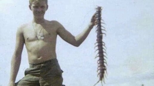 Американский солдат во Вьетнаме поймал и "держит" гигантскую многоножку. Кавычки тут не случайны. Разумеется, это оптическая иллюзия. Многоножку подвесили на леску, а солдат держит ее также, как туристы пытаются спасти от падения Пизанскую башню: Конечно, хоть эта многоножка и не сверхгигант, но довольно крупная. Рекордсмены современности достигают 40 см, хотя подавляющее большинство гораздо меньше. Вот же как на самом деле выглядит крупная многоножка в руках человека: Они и правда довольно крупные и хищные...