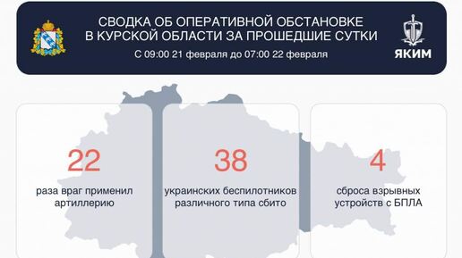 Губернатор Александр Хинштейн сообщил подробности обстрелов Курской области за прошедшие сутки. С 09:00 21 февраля до 07:00 22 февраля наши силы ПВО сбили 38 беспилотников. Противник также нанес 22 артиллерийских удара по отселённым районам и провел 4 атаки с помощью дронов-камикадзе...