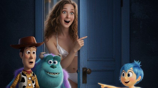 счастливым выражением лица, указывая внутрь комнаты. Мягкое драматическое освещение, малая глубина резкости, высокодетализированная текстура кожи, естественные черты лица. Лицо в точности как на эталонном фото. Вокруг двери стоят несколько известных персонажей мультфильмов в полуреалистичном 3D-стиле, выразительные лица, яркие цвета, плавные текстуры, качество рендеринга Pixar...