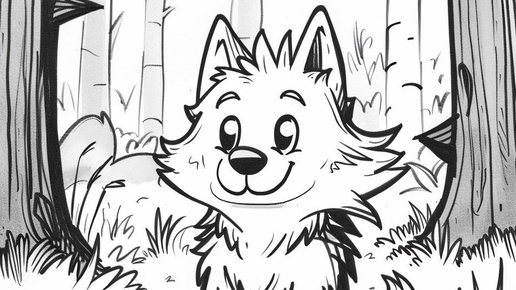 Создано на основе запроса: A simple black-and-white coloring page for toddlers (3 years old) featuring a cute cartoon wolf. Thick, clear black outlines, no shading, no complex details. The wolf should have a friendly expression, round fluffy shapes, and be sitting or standing in a playful pose...