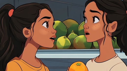 Создано на основе запроса: cartoon of Two young Latinas look intrigued at an orange on the shelf, v5 ar 2:3 –stylize 500