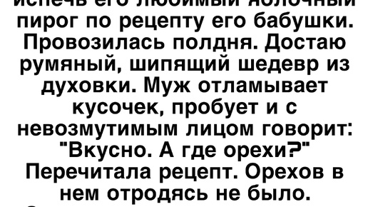 1. Решила порадовать мужа и испечь его любимый яблочный пирог по рецепту его бабушки. Провозилась полдня. Достаю румяный, шипящий шедевр из духовки. Муж отламывает кусочек, пробует и с невозмутимым лицом говорит: "Вкусно. А где орехи?" Перечитала рецепт. Орехов в нем отродясь не было. Оказалось, он за все годы ни разу не ел тот самый "бабушкин" пирог и просто решил, что так должно быть вкуснее. 2. Стою в очереди в банке. Передо мной парень с дикими татухами, в косухе, суровый такой. Вдруг у него на плече шевелится капюшон его толстовки, оттуда вылезает крошечный хомячок, начинает умываться...