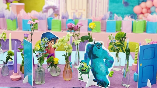 Мы устроили сказочный праздник для малышки Мирель, которая очень похожа на Бу из «Корпорации монстров»! Так и родилась эта необычная тематика. А если вы тоже обожаете этот мультик, то вы будете в восторге от того, что мы напридумывали! На входе в главное помещение всех встречал тематический плакат (заметили Мирель в роли Бу?) и огромная гирлянда из шаров в цветах мультика. Главным элементом нашего оформления стала огромная фотозона! Слева было панно в виде Майка — ярко-зелёное с большим глазом, справа — Салли, пушистый и синий, прям как в мультике...