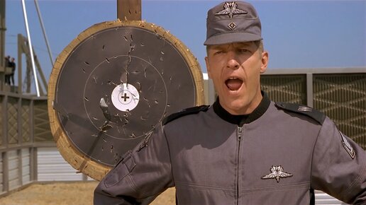 Ознакомившись с политическими интригами третьего фильма, вернёмся к самому первому. «Звёздному десанту» Пола Верхувена 1997 года. Подготовка мобильной пехоты в нём показана весьма впечатляюще. Урок сержанта Зима, пришпилившего метательным ножом руку рядового, забыть невозможно. Но почему-то никто не задаёт элементарного вопроса — а разве нож, брошенный обычной человеческой рукой, может нанести хоть какой-то ущерб хитиновой челюсти или конечности арахнида? Если нет, то какой смысл в этом уроке? То, что врагом людей в назревающей космической войне будут именно арахниды, сомнений нет...