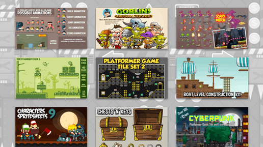 2D ассеты для вашей будущей игры, которая заработает миллионы (¬‿¬). Ассеты на любой вкус. Есть и паки для бэкграундов. И паки с эффектами. Различные тайловые паки. Есть и паки с персонажами. Или с элементами окружения...