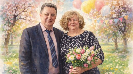 🗯️Писал сегодня про поздравление своего коллектива, но вместе с ним всегда поздравляю женщину, которая сопровождает меня по жизни - супругу Анну. 📸Фото, конечно, сделали. Попросил нейросеть сделать из него семейный портрет...