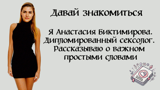 Меня зовут Анастасия Биктимирова, и я здесь, чтобы говорить о том, что часто замалчивается: про сексуальность, отношения, тело, желание и право быть собой. — сексолог с красным дипломом