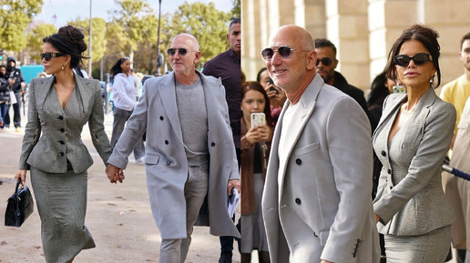 На Неделе моды в Париже Джефф Безос и Лорен Санчес снова стали самой обсуждаемой парой. Их выход в Le Grand Café выглядел не как обычный ланч, а как сцена из фильма о любви и гармонии пары. Безос выбрал серый тренч с чёрными пуговицами, джинсы и футболку в тон — минимализм, который говорит громче любых логотипов. Простота, уверенность и умение выглядеть дорого без усилий — именно этот стиль сегодня становится новым признаком силы. Рядом Лорен — в винтажном ансамбле John Galliano весна–лето 1995: серый пеплум-жакет с чёрными пуговицами и миди-юбка в тон...