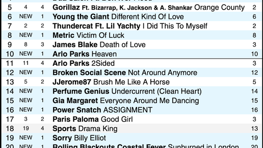 MITSKI стартует в чарте с первого места с синглом "I'll Change For You". DUA SALEH & BON IVER, YOUNG THE GIANT, METRIC и ARLO PARKS дебютировали своими синглами в первой десятке чарта. DUA SALEH, GIA MARGARET, POWER SNATCH, FRIKO и MANDY, INDIANA впервые попадают в чарт. Дольше всех - 9 недель в чарте синглы у GORILLAZ и CAMERON WINTER. На этой неделе в чарте появилось 19 новых трека (и на прошлой - 18). Обратите внимание - специально для тех, кто хочет услышать только самое важное. Слушайте ниже эти новые синглы в первую очередь: 1...