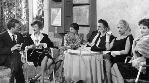 Уникальный кадр со съёмок «Сладкой жизни»: Марчелло Мастроянни, Анук Эме, Луиза Райнер, Федерико Феллини, Анита Экберг и Ивонн Фюрно вместе