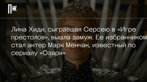 Лина Хиди, сыгравшая Серсею в «Игре престолов», вышла замуж. Ее избранником стал актер Марк Менчака, известный по сериалу «Озарк»