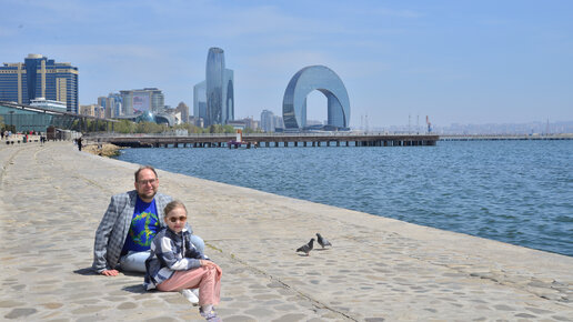 Утром 20 апреля мы вышли на балкон и нас ожидал вот такой шикарный вид. В Баку мы прилетели в 4 ночи по местному времени, нас встретил водитель лет тридцати, который плохо понимал по-русски. Тридцать минут нас полусонных везли сквозь современный город, струящийся огнями. "Эту башню купил Трамп. Там ничего нет. Она пустая", - водитель показал на высотку в форме паруса. Он пытался объяснить про другую высотку, мерцающую жёлто-зелёными квадратами, но у него явно не хватало слов. Позже узнал, что 200-метровая башня принадлежит государственной нефтяной компании SOCAR...