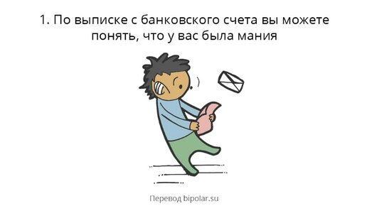 Случайно нашла в интернете подборку рисунков с описанием, что, собственно, такое биполярное аффективное расстройство. Примерила на себя. Получилось довольно интересно, а вот точно или нет... Думаю всё же не совсем. Хотя, надо разобрать по пунктам. 1. Частое явление при БАР - чрезмерная трата денег. До постановки диагноза я не придавала этому достаточного значения. К счастью, я не брала кредиты и не влезала долги. К счастью, у меня есть муж, который финансово страхует. А значит, я и без всяких маний могу потратить свои деньги...