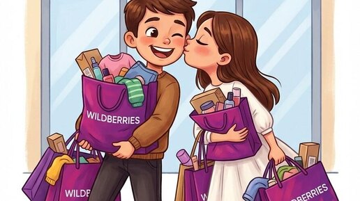 Модель: Nano Banana Сгенерировать🪄 Примени лица людей с фото. На изображении представлена стилизованная цветная иллюстрация в мультяшном стиле, в стиле открытки лав ис, изображающая двух персонажей — мальчика и девочку, которые несут большие пакеты из пункта выдачи wildberries. Оба персонажа уверенно стоят рядом, при этом мальчик обращён слегка вправо, а девочка — влево, образуя динамичную композицию. Девочка, одета в белое платье и розовые туфли, а мальчик в коричневый свитер, темные брюки и коричневые ботинки...