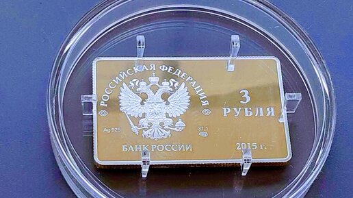 Доброго времени суток уважаемые читатели! В 2015 году по решению Центрального Банка Росии была выпущена монета номиналом три рубля. Необычность монеты заключалась в том, что вместо привычного вида монета имеет прямоугольную форму, помещена она в специальную антивандальные капсулу. Чеканка монеты номиналом 3 рубля была посвящена выпуску первой платежной карты НСПК. По форме и по оформлению реверса монеты, напоминает банковскую карту. Аверс монеты указывает на то, что денежный знак является платёжным...