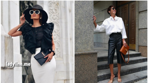 Черное + белое — контрастное сочетание, которое никогда не приесться, это безупречная классика  на все времена. Сегодня мы предлагаем вам ознакомиться с очаровательными идеями образов, которые «построены» на этих двух цветах. Хотите выглядеть эффектно без минимальных затрат — этот вариант образа идеально подойдет вам. Черная футболка + белые брюки + белоснежные высокие кеды — стильно и современно. Классический брючный костюм чудесно смотрится с базовой белой футболкой. Минималистичные черные босоножки с тонкими перемычками уместно завершают всю эту композицию...