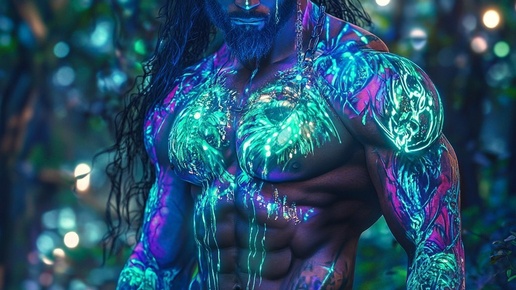 Создано на основе запроса: Retrato hiperrealista de un centauro mitológico, con detalles humanizados en su rostro y cuerpo musculoso, mirando directamente a la cámara con una expresión poderosa. Su torso y patas de caballo están decorados con tatuajes luminosos en tonos neón como fucsia, turquesa y verde brillante. El entorno es un bosque mágico iluminado por luces vibrantes, listo para fondos de pantalla o impresiones en 300dpi...