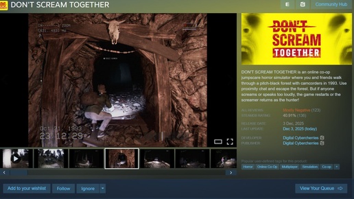 Наблюдаем интересный запуск Don't Scream Together Это кооп, можно сказать, френд-хоррор-полуслоп. Называется Don’t Scream Together. Ребята стартовали примерно с топ-180 в вишлистах. Это дофига. На старте они собрали меньше чем за неделю 100 000 вишов. Трейлер разогрелся, растёкся, завирусился. И вот они вышли. Как вы видите, рейтинг провалился ниже 50 на старте. Мостли негатив, такого давно не видел. При этом держится 46-я позиция в Top Sellers, а это прямо дофига капусты в день. Что на следующие сутки? Оценка подросла: разрабы извинились очень активно, 53% (Mixed) уже есть...