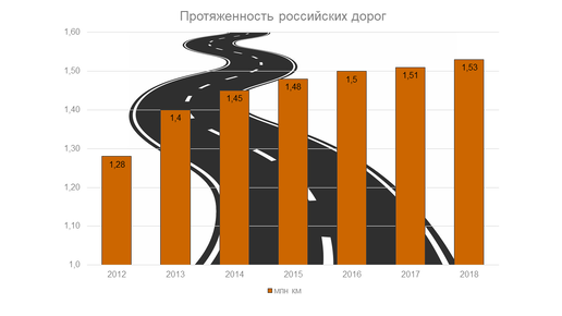 Протяженность российских дорог, с учётом городских улиц: Из них дороги с твердым покрытием — примерно 70%. Что такое дорога с твердым покрытием? Это, в первую очередь, асфальт и бетон. Хотя гравийные и грунтовые дороги тоже нужно строить и обслуживать. На грунтовые трассы федерального, регионального или межмуниципального значения приходится 7,3% от общей протяженности. 28,2% сельских населенных пунктов страны вовсе не имеют дорог с твердым покрытием для связи с основной сетью дорог. В 2020 году в России планирует сдать после строительства и реконструкции более 280 км скоростных дорог...
