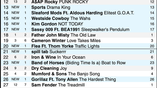 MITSKI дебютирует и занимает первое место с песней «Where Is My Phone?». GORILLAZ, ARLO PARKS, DAUGHTER и CAVETOWN также дебютируют в первой пятерке с новыми синглами. FCUKERS, MASTER PEACE, WATERBABY, CLOTHESLINE FROM HELL и ANY YOUNG MECHANIC впервые попадают в чарт. Дольше всех - 14 недель в чарте сингл у TAME IMPALA, одного из немногих старичков чарта. После новогодней спячки уже вторую неделю ажиотаж и тектонические сдвиги в чарте. Он почти полностью обновился. На этой неделе в чарте появилось 22 новых трека (на прошлой - 21)...