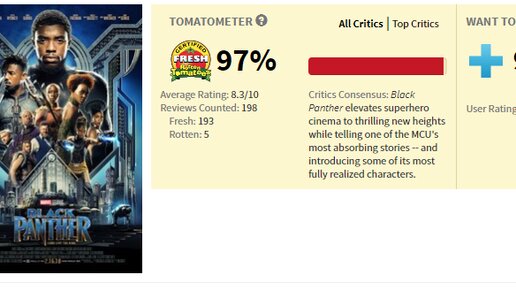 Черный черный режиссер, вместе с черными черными актерами, снял черный черный фильм про черную черную пантеру Профессиональные кинокритики портала Rotten tomatoes считают фильм "Черная Пантера" шедевром. По их мнению фильм «поднимает супергеройское кино на впечатляющий новый уровень». По началу он даже обгонял такие фильмы, как: Побег из Шоушенка, Славные парни, Крёстный отец. Но эти рейтинги были абсолютно ожидаемыми. В фильме снялись чуть ли не все темнокожие голливудские звезды, почти все актеры - черные, режиссер - черный...