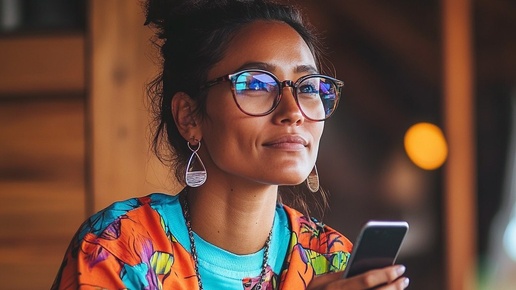 Создано на основе запроса: A fashionable cool pacific island woman with glasses, in colourful actovewear and sneakers. Sitting, talking over smartphone. --- Автоперевод: Модная прохладная женщина -тихоокеанская островная женщина со очками, в красочной активной одежде и кроссовках...