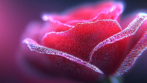 Создано на основе запроса: Close-up macro photograph of the petals and petal edges of a rose, in a red color, with a dark pink background, lit from above, with a shadow on the left side. Captured with a Canon EOS R5 camera, using an F2 aperture, ISO 400, and an 8mm lens. The image has soft shadows, low contrast, and a clean, sharp focus, with a cinematic photography style...