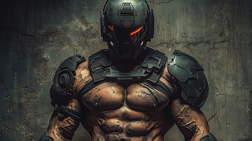 Создано на основе запроса: allegory of masculinity and modernism in a battle / ripped man in a futuristic mechanical cyberpunk military uniform with a helmet / atmospheric / dark / grainy / gritty / imposing / intense / intimidating / menacing --- Автоперевод: Аллегория мужественности и модернизма в...
