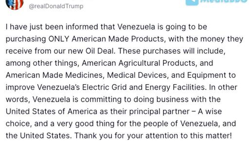 Вот что у Трампа не отнять, так его искренность. Он не умеет притворяться, а действует смело, грубо, как настоящий слон в посудно лавке, которому наплевать, что о нем скажут. Вот и это крайнее сообщение в его блоге говорит как раз об этом его качестве. В нем речь идет о том, что США, продав венесуэльскую нефть, разрешат Каракасу закупать за эти деньги продукцию, выпущенную в Штатах. Кто не в курсе, во время создания колониальных европейских империй у всех их было такое правило...