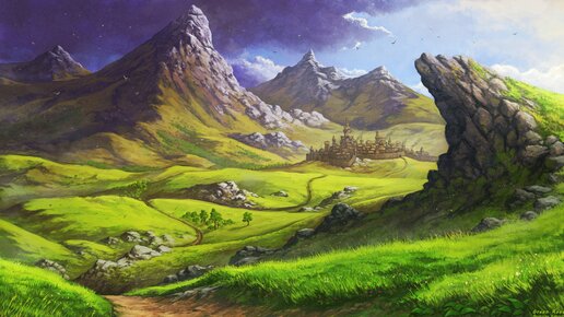 Зеленая долина была окружена горами. У подножия лежали огромные камни, поросшие зелёным мхом. А на вершинах росли зелёные деревья. Когда посыпалось солнце и своими оранжевыми лучами золотило верхушки гор, то зелёная долина покрывалась разноцветными цветами. В это время из пещеры доносился вздох и показывался мохнатый хвост. Птицы, сидящие на ветках магнолии, замолкали и, затаив дыхание, ждали. Наконец наружу выползал зелёный дракон и, сладко потягиваясь, падал на не высохшую от росы траву, подставляя пузо первым лучам солнца...