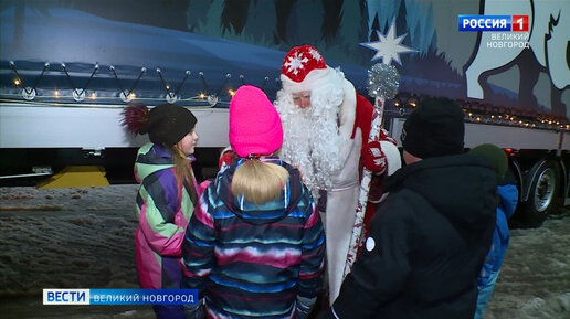 В новогодние праздники для новгородцев и гостей было приготовлено немало необычных поздравлений. Так сотрудники компании по производству сложной прицепной техники "Гут Трейлер" пустили по улицам областного центра украшенный яркими огнями автопоезд. Коллектив предприятия постарался сделать всё с душой, чтобы атмосфера доброго праздника передалась горожанам и, конечно, трейлер делал остановки, чтобы их поздравил Дед Мороз. А ещё, как и положено, Дед Мороз дарил гостинцы. Сотрудники компании подготовили для ребятишек подарки с мандаринами - самым новогодним фруктом...