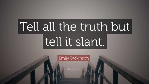 Tell all the truth but tell it slant — Success in Circuit lies Too bright for our infirm Delight The Truth's superb surprise As Lightning to the Children eased With explanation kind The Truth must dazzle gradually Or every man be blind — Tell all the truth but tell it slant— (#1263) by Emily Dickinson Первые обращения к творчеству Эмили Дикинсон на русском языке в виде перевода ее стихов датируются 1946 годом. С тех пор произведения поэтессы продолжают привлекать внимание новых переводчиков,...