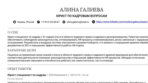Пример резюме юриста-специалиста по кадрам 2025