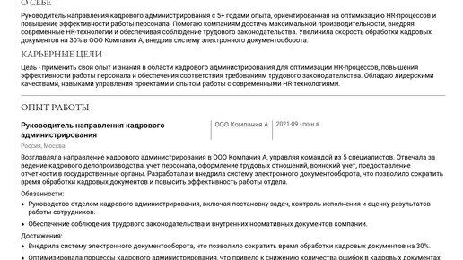 Пример резюме руководителя направления кадрового администрирования 2025