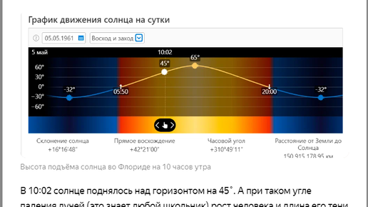 Пишу, потому что комментаторы под моим постом "Кинооператор и фактчекинг...." разошлись не на шутку. Началось все с этого поста: А дальше в ход пошли всевозможные онлайн калькуляторы, Стеллариумы и прочая. В чем суть спора и почему кинооператор ошибся там, где школьник должен справляться? Суть вопроса в высоте Солнца над горизонтом. Кинооператор тоже воспользовался онлайн калькулятором и написал: Обратим внимание на значение максимальной высоты Солнца над горизонтом 5 мая 1961 года. У кинооператора оно равно 65 градусам...