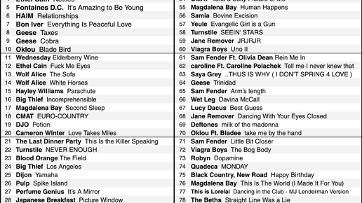 Для начала представим артистов с максимальным количеством синглов в этом году: 22. TURNSTILE - NEVER ENOUGH 81. CMAT - Running/Planning 64. Geese - Trinidad 38. Tame Impala - Dracula 3 трэка у следующих артистов: * Ethel Cain