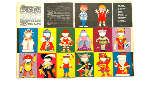 Итак, как мы с вами выяснили, первых бумажных куколок в журнале "Весёлые картинки" напечатали в феврале 1963 года. А в следующий раз -- в июне 1965-го. И это были не совсем стандартные бумажные куколки, не такие, к каким мы с вами привыкли: Эта игра называется "Весёлый маскарад". Вот эти полосочки надо разрезать по горизонтали не вырезая наряды, и склеить между собой -- если присмотреться, на чёрных полосочках по бокам написано "клей". Вырезать надо только дырки для лиц. А полосочки после склеивания...