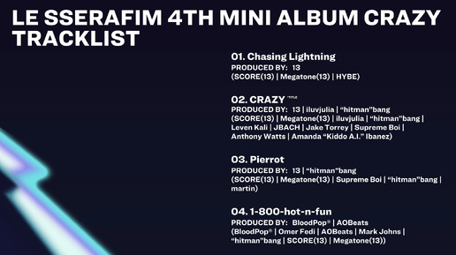22 августа на официальных страницах группы LE SSERAFIM в социальных сетях был опубликован трек-лист их четвертого мини-альбома 'CRAZY' (Крэйзи), подготовленного музыкальной компанией Source Music. В новом альбоме представлено пять треков, включая заглавную песню, одноимённую альбому, а также 'Chasing Lightning' (Чейзинг Лайтнинг), 'Pierrot' (Пьеро), '1-800-Hot-N-Fun' (1-800-Хот-Н-Фан) и 'The Reason I Can't Go Crazy' (Мичиджи Мотханын Ию). Заглавный трек 'CRAZY' (Крэйзи) представляет собой произведение в жанре EDM, опирающееся на элементы хаус-музыки...