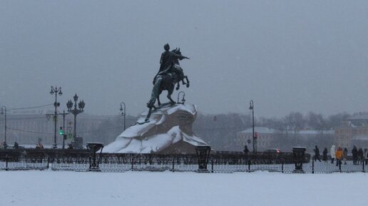 Сумерки, снег и ветер, которые сошлись в Петербурге 23 ноября, принесли не только грязь, но и особенную зимнюю красоту. Вечером жители и гости города могли заметить, как слегка изменился силуэт Медного всадника на Сенатской площади. Корреспондент Мойки78, прогуливаясь по городу, заметил, что памятник будто изображен на негативе пленки фотоаппарата. Такое впечатление складывается из-за белого неба и снега, продолжающего застилать город. Медный всадник при этом ярко выделяется на контрасте, а снег на памятнике четко выделяет его изгибы...