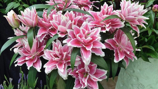 Шикарные высокорослые лилии (100-110см) с крупными (диаметром около 20-21см) густомахровыми цветками. Цветки без пыльцы, с легким ароматом и изящным гофре по краю лепестков. На цветоносе образуется 9-10 бутонов. Роуз-Лили - это длительное цветение в саду и великолепная срезка...